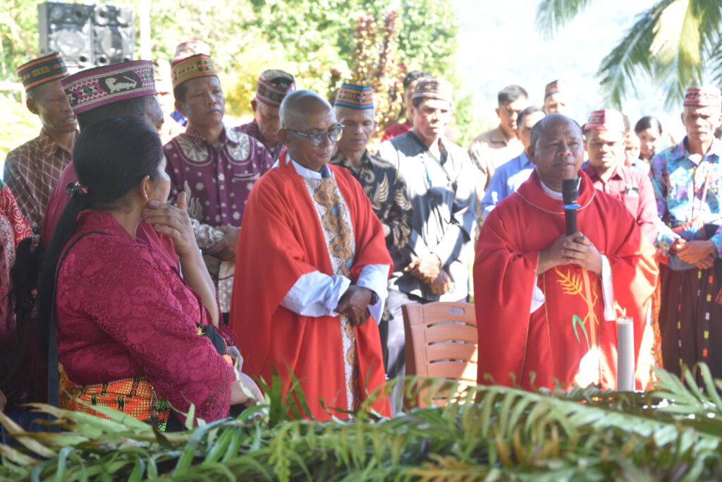Setelah perarakan, umat berkumpul di dalam gereja stasi yang sederhana namun tertata rapi dengan dinding bambu. Misa dipimpin oleh imam dengan mengenakan kasula berwarna merah, warna liturgi yang melambangkan pengorbanan dan sengsara Kristus.