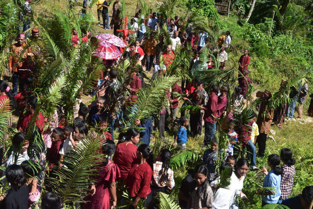KALO – Ratusan umat Katolik Paroki St. Kristoforus Waning merayakan misa Minggu Palma di Stasi Kalo (salah satu stasi dari 8 stasi Paroki Waning). Perayaan dimulai dengan ritus pemberkatan daun palem di luar area Kapela stasi. Umat merayakan Minggu Palma dengan penuh sukacita dan kekhusyukan pada Minggu (29/03/2026). Perayaan Minggu Palma mengenang Yesus memasuki Kota Yerusalem  menandai dimulainya Pekan Suci. Dalam renungan singkat Pater Tarsi Nardi,SVD (Pastor Vikaris) mengajak umat untuk senantiasa bersikap rendah hati seperti Kristus Sang Raja yang tampil sederhana Ketika Dia memasuki kota Yerusalem. Pater juga mengajak umat untuk membuka hati membiarkan Tuhan berkuasa dan merajai hati kita.